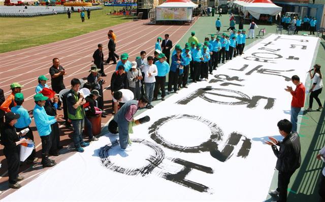 ▲ 부안마실축제 슬로건인 '아름다운 만남, 행복한 동행'을 대형 붓글씨로 쓰고 있다.