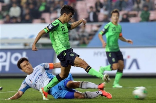 ▲ 전북 현대 레오나르도가 17일 전주월드컵경기장에서 열린 K리그 클래식 대구FC와의 경기에서 선취골을 넣고 있다. 연합뉴스