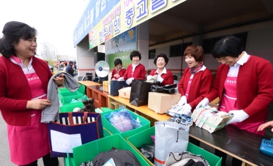 17일 전주 종합경기장에서 열린 행복한 가게 10주년 기념 '전주시민 중고물품 기증의 날'행사에서 회원들이 기증받은 물품을 정리하고 있다.