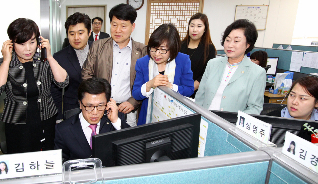 천년전주 콜센터가 지난해 12월부터 3개월간의 시범운영 기간을 거치고 17일 시청 7층 콜센터에서 개소식을 갖고 본격 활동에 들어갔다. 개소식에 참석한 이명연 시의장이 콜센터 운영 과정을 체험하고 있다.