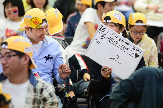 장애인의 날을 사흘 앞둔 17일 전주 자원봉사센터 강당에서 열린 장애인 도전 골든벨행사에서 전동 휠체어를 탄 부부가 환한 웃음을 보이며 문제를 풀고 있다.