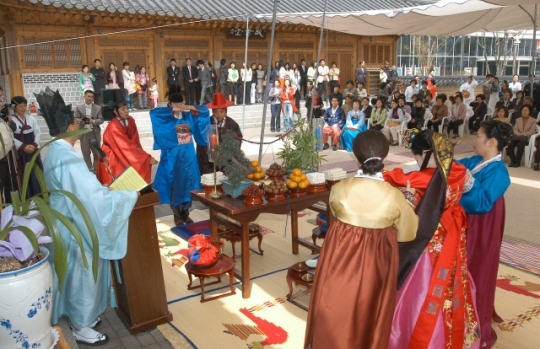 봄의 신부라는 말이 있을 정도로 봄은 결혼의 계절이다. 하지만 대부분의 결혼식은 공장에서 대량생산 방식의 공산품을 찍어 내듯이 예식장에서 신부와 신랑이 하얀 드레스와 턱시도를 차려입고 정신없이 뚝딱 치른다. 하객들은 지루한 주례사를 배경으로 신랑·신부의 등을 보며 잡담하기에 바쁘다. 좀더 다른 결혼식을 원하는 이들이 찾는 것, 바로 전통혼례다. 전주시 교통 전주전통문화관 화명원 마당에서 치러지는 색다른 전통혼례를 엿봤다.