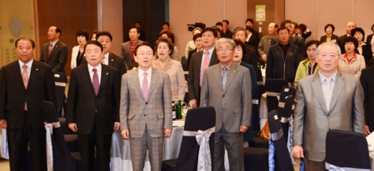 18일 전주 효자동 웨딩케슬에서 열린 제3회 에서 김완주 도지사와 새마을회 지도자들이 국민의례를 하고 있다.