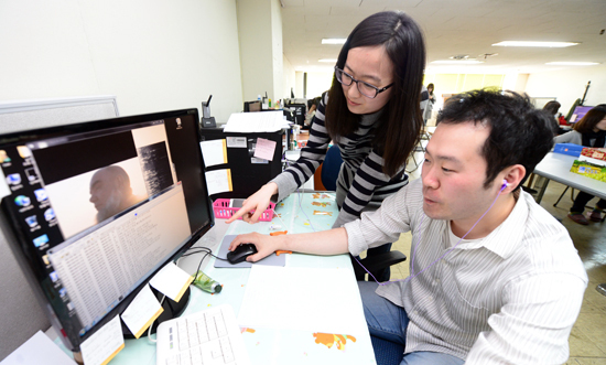 자막팀 사정은 좀 낫다. 영화 마지막에 올라오는 엔딩 크레딧에 이름이 나오고 기술팀이 그토록 갈망하는 햇빛도 본다. 하지만 사무실 분위기는 ‘절간’을 방불케 한다. 많게는 4시간 가까이 되는 영화를 뚫어지게 봐야 하는 것은 기본. 수 십번 반복해서 등장인물들의 대사를 모조리 체크해야 한다. 같은 팀원들과 나누는 말보다 영화 주인공하고 대화하는 시간이 업무의 대부분을 차지한다. 자막팀이 ‘조용한 가족’인 이유다.