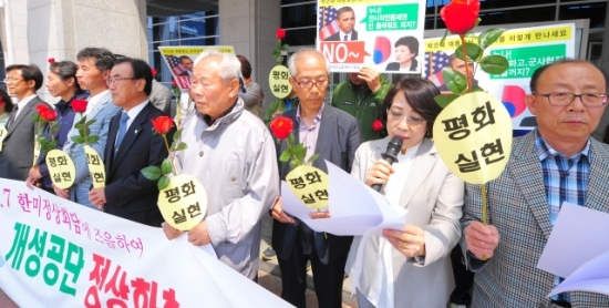 ▲ 6일 전북도청 광장에서 전쟁반대와 평화실현을 위한 전북 시국회의가 한반도의 평화실현을 위한 개성공단 정상화와 평화회담을 즉각 실시하라는 기자회견을 하고 있다. 이강민기자 lgm19740@