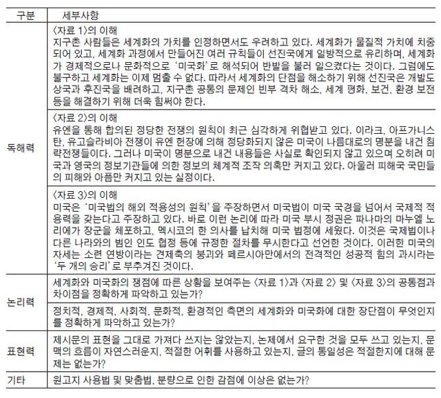 자료들은 세계화가 미국화로 변질되면서 일어나는 공통적인 문제점을 구체적으로 다루고 있다. 우선 세계화가 미국화라는 것이다. 다음으로 미국은 세계 제일의 군사력을 가지고 있는 국가이기 때문에 유엔의 별다른 제제를 받지 않고 뚜렷한 명분 없이 이라크를 공격하였다는 주장이다. 마지막으로 미국은 세계의 질서를 유지하는 '경찰'의 역할을 최고의 군사력을 가지고 하기 때문에 미국법이 해외에서도 적용되어야 된다고 주장하고 있다. 반면 자료들의 주장은 각각 차이점도 있다. 〈자료 1〉은 세계화가 순기능보다는 역기능이 많다는 것이고, 〈자료 2〉는 세계화의 역기능을 해소하기 위해 존재하는 유엔의 권위가 미국에 의해 훼손되고 있다는 것이며, 〈자료 3〉은 세계화의 역기능이 미국에 의해 더욱 심각하게 일어나고 있다는 것이다.