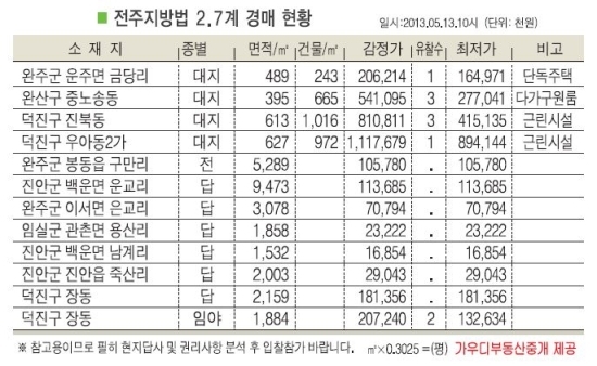 △전주시 덕진구 진북동 근린주택=본건은 덕진구청 남동측 인근에 위치하며, 주위환경은 근린생활시설, 아파트단지, 단독주택, 학교 등이 혼재하는 지역이다. 차량의 접근이 가능하고, 인근 도로변으로 버스 승강장이 위치하고 있어 전반적인 교통상황은 양호한 편이다. 부정형 토지의 주상용 건물용지로서 남측으로 왕복 4차선, 서측으로 소폭의 도로와 접해 있으며, 용도지역은 제2종일반주거지역, 일반미관지구, 대로3류, 상대정화구역이다. 건물의 구조는 벽돌조 슬래브지붕 및 시멘트 기와지붕 2층건으로서 1층 주택 및 음식점, 근린생활시설과 2층 사무소 등으로 이용 중이며, 기본적인 위생설비와 난방설비, 화재탐지설비 등이 되어있다.