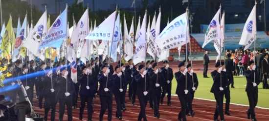 ▲ 지난 10일 김제 시민운동장에서 열린 2013년 전북도민체전 개회식에, 14개 시군 선수단과 많은 관람객들이 운동장을 가득 메운 가운데 선수단 대표 기수대가 입장하고 있다. 추성수기자 chss78@