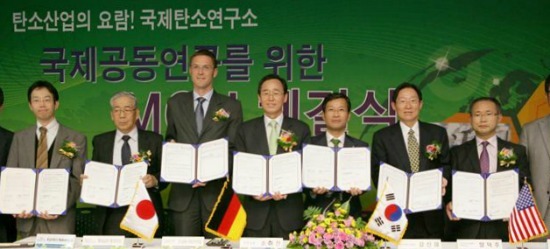 ▲ 지난 2008년 전주에서 한국탄소융합기술원과 공동으로 탄소섬유 개발에 착수한 (주)효성이 탄소섬유 개발에 성공했다. 사진은 국제탄소연구소와 MOU체결식 장면.