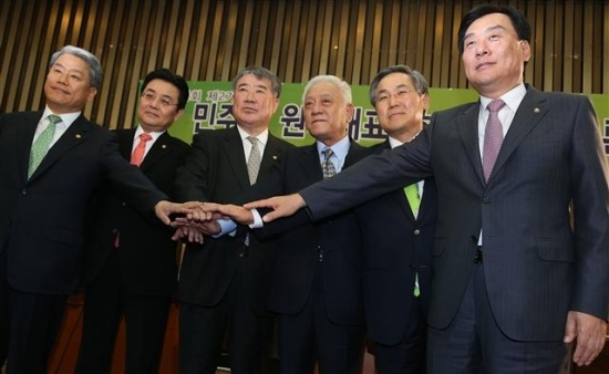 민주당 원내대표 경선을 하루 앞둔 14일 국회에서 열린 후보 합동토론회에서 김한길 대표와 박기춘 원내대표가 후보들과 손을 모으고 기념촬영하고 있다. 왼쪽부터 김동철, 전병헌 후보, 김우남 선관위원장, 김 대표, 우윤근 후보, 박 원내대표. 연합뉴스