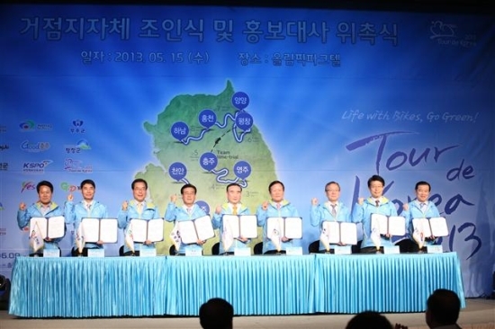 한편, 15일 서울 올림픽파크텔에서는 투르드코리아 2013 대회의 거점도시 조인식이 개최됐다. 이날 행사에는 홍낙표 무주군수를 비롯해 9개 거점도시 단체장들이 참석했으며 국민체육진흥공단과의 업무협약을 통해 성공적인 대회 개최를 위해 협력해 나갈 것을 약속했다.