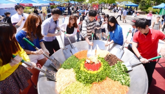 대학생활과 진로, 취업 등의 정보를 교류하는 유니프 엑스포가 '대학문화를 비빈다!'라는 주제로 16일 전북대학교에서 열린 가운데 대학생들이 비빔밥 200인분 만들기 퍼포먼스를 하고 있다.