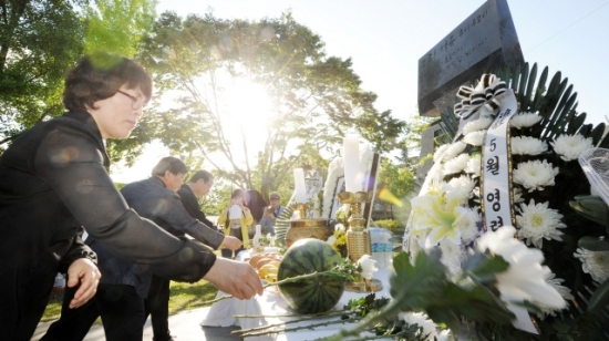 5·18 민주화운동 33주년을 맞아 지난 17일 전북대학교에서 열린 이세종 열사 (5·18 최초 희생자, 당시 21세 전북대 농학과 2학년)추모식에서 참석자들이 헌화를 하며 열사의 희생을 기리고 있다.