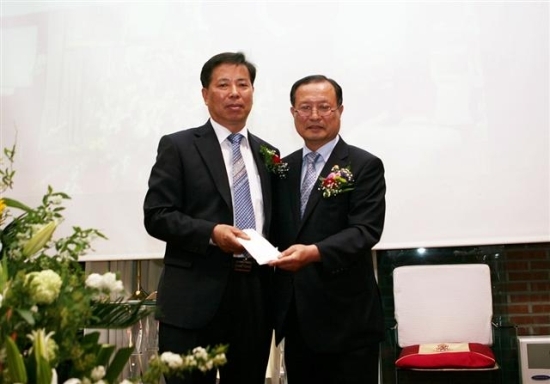 ▲ 18일 열린 오수교회 설립 100주년 기념식에서 권종오 목사(오른쪽)가 신현택 부군수에게 이웃돕기 성금을 전달하고 있다.