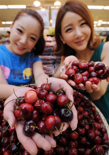 20일 오전 서울 한강로동 이마트 용산점 과일매장에서 모델들이 미국 캘리포니아산 체리를 선보이고 있다. 이마트는 오는 22일까지 체리를 6950원(450g)에 판매한다. 연합뉴스