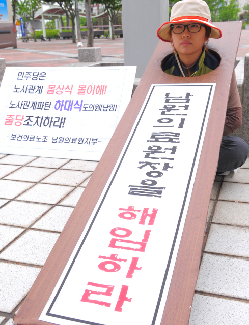 20일 전북도의회 정문앞에서 보건의료노조 남원의료원지부 회원이 남원의료원장을 해임하라는 1인 시위를 하고 있다.