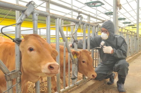 전북 구제역 청정지역 유지를 위한 일제 예방접종이 20일 시작된 가운데 진안군 한 축사에서 수의사가 예방접종을 하고 있다. 전북도는 다음달 7일까지 3주간에 걸쳐 소 31만두를 대상으로 예방접종을 실시한다.
