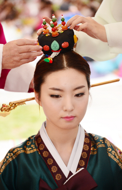 제41회 성년의날 기념식이 20일 전주 향교에서 전통 성년례로 열린 가운데 성년을 맞은 대학생이 비녀를 꽂고 머리를 올려 쪽을 찌는 계례의식을 갖고 있다. 전통 성년의식인 관·계례의미는 어른으로서의 책임과 의무를 일깨우는데 있다.