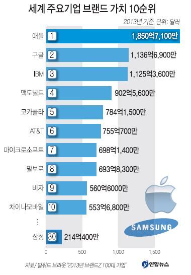 조사대상 주요기업 중 브랜드 가치 1위는 1천850억7천100만 달러를 기록한 애플로 집계됐다. 그러나 애플의 브랜드 가치는 작년에 비해 1% 상승하는데 그쳤다. 지난해 3위를 차지했던 구글은 올해 브랜드 가치가 5% 상승한 1천136억6천900만 달러를 기록, 순위도 2위로 올라섰다. 이어 IBM, 맥도널드, 코카콜라가 각각 1천125억3천600만 달러, 902억5천600만 달러, 784억1천500만 달러 등으로 각각 3∼5위를 차지했다. 연합뉴스