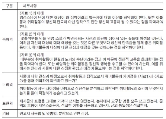 이번 논제의 제시문은 논리적인 글이 아니라, 고등학교 교과서에 실려 있는 수필이다. 따라서 제시문 분석에서 글쓴이의 관점을 파악하는 것이 필요하다. 자료1과 자료2의 제시문에 나타난 글쓴이의 관점을 파악해서 차이점을 제시하고, 자료3을 바탕으로 자신의 견해를 논술해야 한다. 이런 점에서 최원영 학생은 관점의 파악과 제시문에 대한 요약이 적절하다.