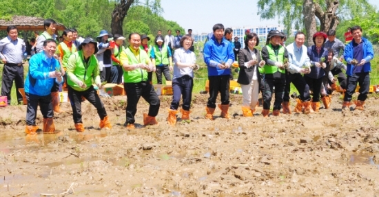 21일 전주 오송제에서 열린 멸종위기 야생식물'전주물꼬리풀'복원식제 행사에서 참석자들이 물꼬리풀을 식재하고 있다.