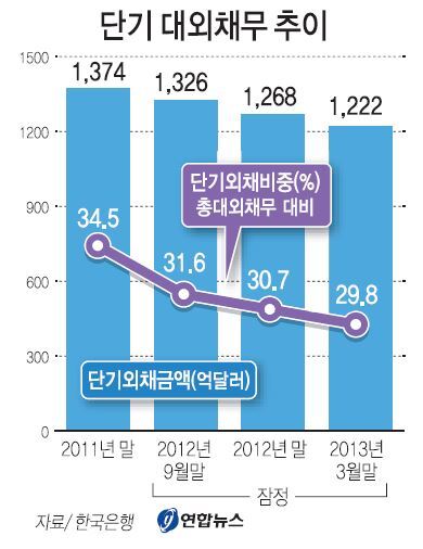 이에 따라 전체 대외 채무 중 단기 외채가 차지하는 비중은 29.8%로, 1999년 말(29.7%)이후 처음 20%대로 내려가면서 13년3개월만에 가장 낮은 수준을 기록했다. 이는 금융위기 시점인 2008년 9월말(51.9%)에 비해서는 무려 22.1%포인트나 낮은 수준이고 국제통화기금(IMF) 구제금융 이후 처음으로 30%대 밑으로 떨어진 것이다.