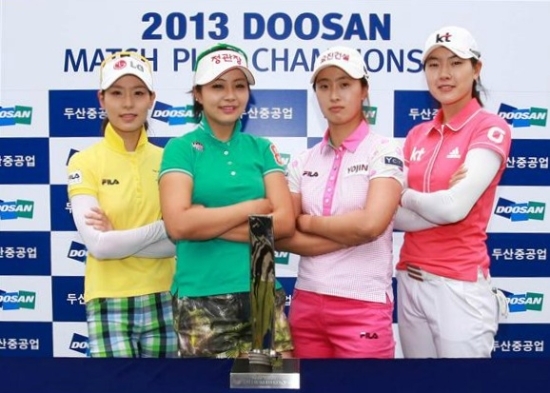 두산매치플레이 역대 우승자 오는 23일 춘천 라데나 골프장에서 개막하는 두산 매치플레이 챔피언십에 출전하는 선수들이 22일 대진추첨을 한 뒤 우승트로피를 들고 포즈를 취하고 있다. 왼쪽부터 역대 우승자 김자영, 양수진, 김보경, 이정민. 연합뉴스