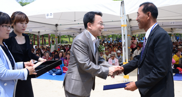 23일 전주 덕진공원에서 열린 전북시각장애인연합회 전주시지회 주최 제14회 및 가족한마당 행사에서 김완주 지사가 심청이상 시상을 하고 있다.