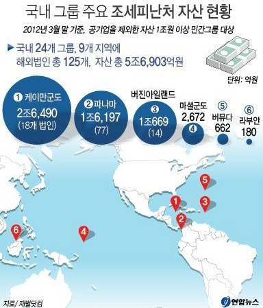 이들 지역은 세율이 매우 낮고 금융 규제를 피할 수 있어 탈세 가능성이 존재하는 곳이다.자산으로는 케이만군도 소재 18개 법인의 자산총액이 2조6천490억원으로 가장 많았고 파나마 소재 77개 법인이 1조6천197억원, 버진아일랜드 소재 14개 법인이 1조669억원이었다. 연합뉴스