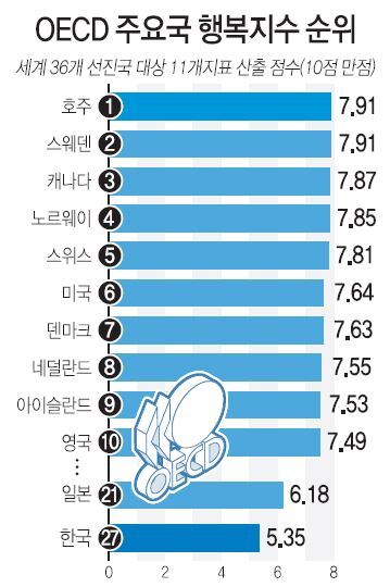 경제협력개발기구(OECD)가 세계 36개 선진국을 대상으로 삶의 질 수준을 '행복지수'로 환산한 결과 한국이 하위권인 27위에 그친 것으로 나타났다.