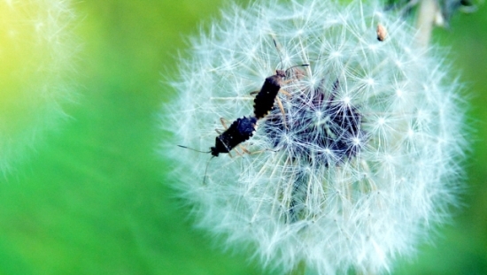 2일 무더운 날씨 속 완주군 한 들녘에 노린재 벌레가 짝짓기를 하고 있습니다. 악취로 유명한 노린재지만 이날 하루는 하얀 솜털 이불 같은 민들레 홀씨위에서 사랑을 나누며 로맨틱한 시간을 보내고 있습니다.