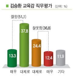 김승환 전북도 교육감의 직무수행에 대해서는 응답자의 절반이 조금 넘는 51.1%가 '매우 잘하고 있다'(13.3%), 또는 '대체로 잘하고 있다'(37.8%)는 긍정적 평가를 내놓았다. 반면 '매우 잘못하고 있다'(12.4%)·'대체로 잘못하고 있다'(24.4%)는 부정적 평가는 36.8%로 나타났다.