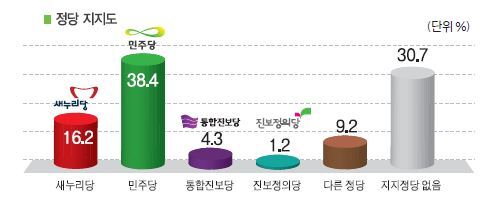 이어 새누리당 16.2%, 통합진보당 4.3%, 진보정의당 1.2%로 나타났고 기타 다른 정당이 9.2%, 지지하는 정당이 없다는 무당층은 30.7%에 달했다. 이는 도내 각 시·군별로 300명씩(전주는 600명), 총 4500명을 대상으로 실시한 조사값을 토대로 14개 시·군별 유권자 수 비율을 적용해 정량 통계값으로 분석한 결과다.