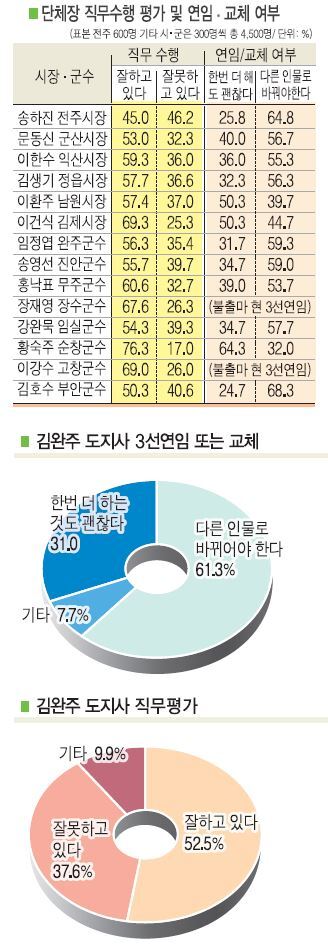 내년 지방선거에서의 현직 단체장 연임 또는 교체 여부에 대해서는 황숙주 순창군수와 이환주 남원시장·이건식 김제시장 등 3명에 대해서만 '한번 더 하는 것도 괜찮다'는 답변이 '다른 인물로 바꿔야 한다'는 응답보다 많았다. 반면 김호수 부안군수와 송하진 전주시장·임정엽 완주군수·송영선 진안군수 등 나머지 지역 시장·군수에 대해서는 지역민들의 교체 여론이 높아 세대교체 바람을 예고했다.