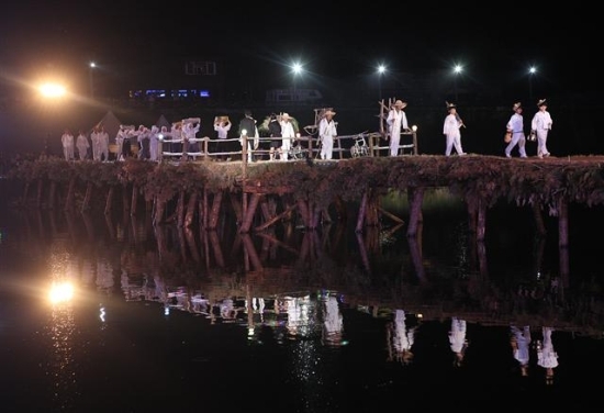 ▲ 무주 남대천 섶다리 위에서 펼쳐지는 뮤지컬 공연 '반딧불 사랑'의 한 장면.