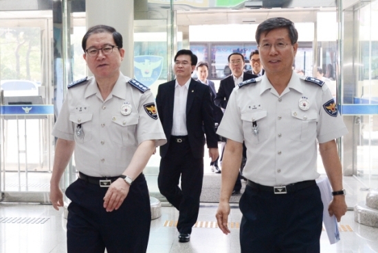▲ 이성한 경찰청장(왼쪽)과 홍익태 전북경찰청장이 5일 전북지방경찰청사로 들어오고 있다. 추성수기자chss78@