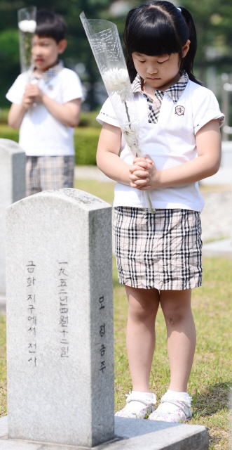 현충일을 하루 앞둔 5일 전주 군경묘지를 찾은 유치원생들이 순국선열과 호국영령들을 추모하며 묵념하고 있다.