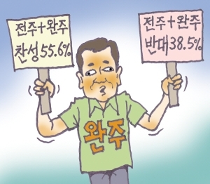 △완주군민, 전주와 통합 찬성 55.6·반대 38.5%= 전북일보가 창간 63주년을 맞아 여론조사 전문기관인 '리서치뷰'에 의뢰, 지난달 27일 완주군에 거주하는 만 19세 이상 성인남녀 800명을 대상으로 전주·완주 통합에 대한 찬·반 견해를 물은 결과 55.6%가 '찬성' 의견을 냈다. 이에 비해 '반대한다'는 견해는 38.5%로 찬성 응답과 17.1%p 차이가 났다.