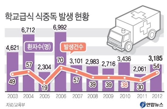 9일 교육부에 따르면 학교 급식 식중독 사고는 지난해 54건으로 전년(30건)과 비교해 80.0% 증가했다. 식중독 사고는 2006년 이후 감소 추세였다가 지난해 처음으로 상승세로 돌아섰다. 특히 2007년 57건 이래 5년 만에 최대치를 보였다. 환자 수는 3천185명으로 전년(2천61명)보다 54.5% 늘었다.