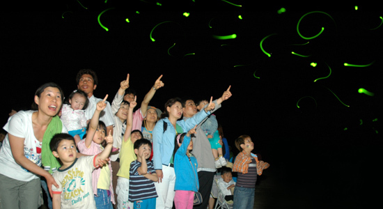 ▲ 무주 반딧불축제장을 찾은 가족단위 방문객들이 어둠 속에서 펼쳐지는 반딧불이의 군무를 보며 즐거워하고 있다.