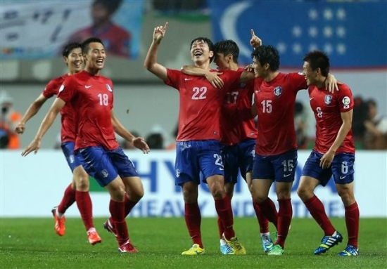 ▲ 11일 오후 서울 성산동 서울월드컵경기장에서 열린 2014 브라질월드컵 아시아지역 최종예선 7차전 대한민국과 우즈베키스탄의 경기. 센터링을 올려 자책골을 만들어낸 김영권이 동료들과 환호하고 있다. 연합뉴스