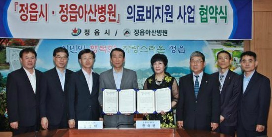 김생기 정읍시장과 문숙란 정읍아산병원장은 지난 12일 정읍시청 영상회의실에서 최영만 부시장등 양측 관계자들이 참석한 가운데 '특정질환의료비 지원 협약식'을 갖고 서명했다.