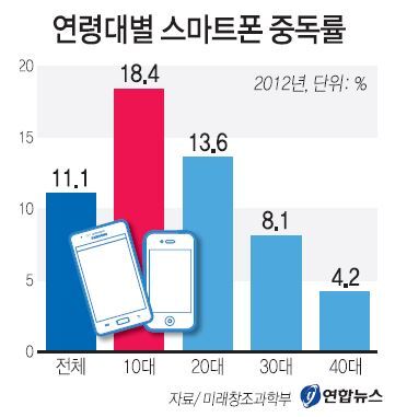 미래창조과학부가 13일 발표한 '2012 인터넷중독 실태조사'에 따르면 청소년(만 10~19세)의 스마트폰 중독률은 18.4%로 전년(11.4%)보다 7.0%포인트 증가했다.