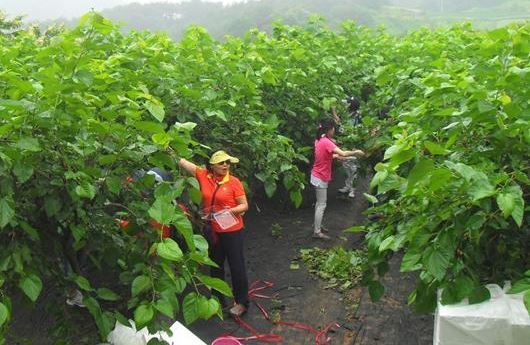 ▲ 순창군이 운영하고 있는 농산물수확체험에 참여한 도시주부들이 오디를 직접 수확하고 있다.