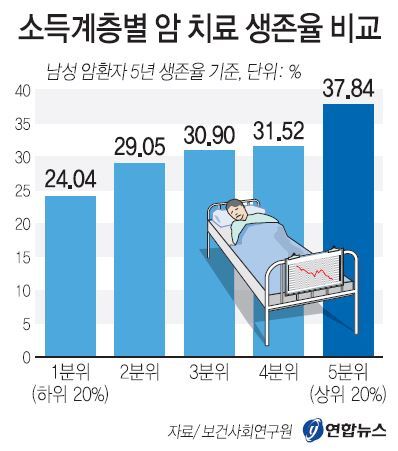 18일 보건사회연구원의 '우리나라 건강형평성 현황 및 대책' 보고서에 따르면, 암환자 4만3천여명의 소득계층별 생존율을 분석한 결과, 소득 5분위(상위20%) 남성 환자의 5년 생존율은 37.84%로 소득1분위(하위20%)의 24.04%보다 13.80%포인트(p)나 높았다.