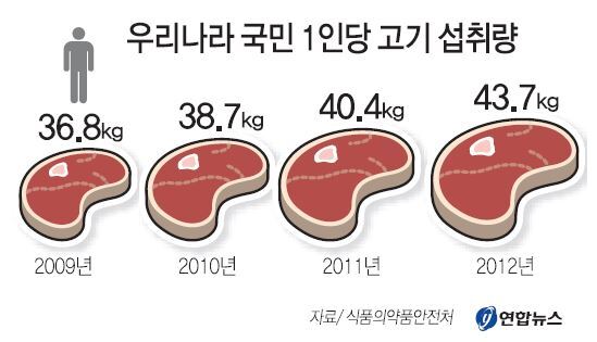 고기 소비량은 매년 늘어 2009년 1인당 소비량은 36.8㎏(총 소비량 178만198t)이었고, 2010년에는 38.7㎏(총 196만7천244t), 2011년에는 40.4㎏(200만9천675㎏), 지난해에는 43.7㎏으로 4년 만에 22.3% 증가했다.