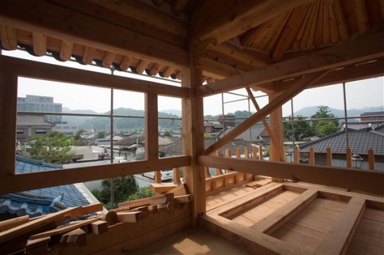▲ 이택근씨가 전주 한옥마을에서 건축 중인 한옥이 목재로 이루어진 골격을 갖춰 나가고 있다.