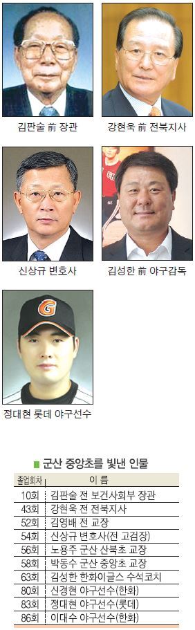 군산중앙초는 정치계 거목과 '역전의 명수'로 불리는 군산상고 야구부 출신을 다수 배출했다. 11살 어린나이에 3.1운동에 투신한 김판술(10회) 전 보건사회부 장관이 대표적 정치인이다.