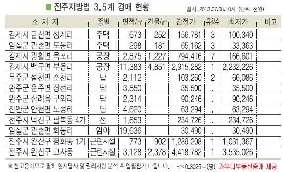 △전주시 덕진구 팔복동 4가(전)=본 건은 현대시멘트 전주공장 서측에 인접해 소재하고 , 인근지역은 공업단지 주변 미개발 농경지대이다. 지적도상 맹지이고 인접지 및 소폭의 농로를 통해 도보로 출입은 가능하나 차량접근이 불가능하다. 일반공업지역 미관지구 비행안전 4구역(지원)(군사기지 및 군사시설 보호법)이며, 인접지와 등고 평탄한 부정형지로서 현황 전으로 이용중이다.