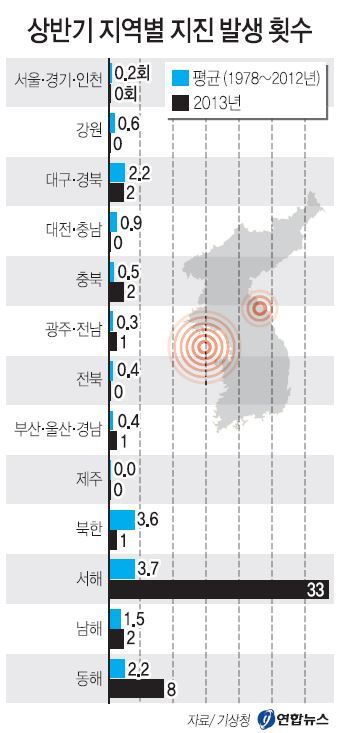 상반기 지진 발생 횟수 50회 중 33회가 서해에서 발생했다. 그중 31회는 백령도와 어청도 해역에서 발생했다.